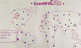 One group had a discussion around a human Uber, or a surrogate for meetings, events; as well as collaborative video watching. Another had devised a globe distributed to all students on induction which lights in particular areas when particular activity is performed. Another suggested a mood lamp of activity from the students worldwide, a soft presence. Another group discussed an app showing activity on different campuses. Another had an interface showing locations (anonymously) of all students in one color, a color which shifts if the student indicates their willingness to chat. Ambient awareness of the larger community abounded in all these works.